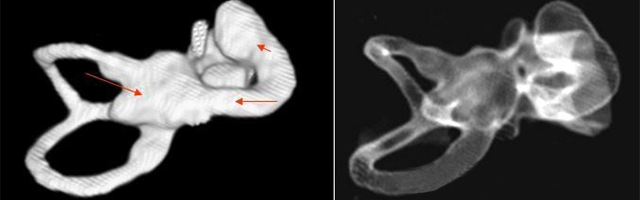 先天性內耳畸形的疾病種類繁多,診斷比較困難,隨著高分辨CT和磁共振(MRI)的應用,目前診斷率不斷提高。臨床常見的內耳畸形包括大前庭導水管綜合癥、先天性耳蝸畸形、米歇爾聽障及沙伊貝聽障。本篇將后三種畸形介紹如下:</p><p> 先天性耳蝸畸形(Congenital cochlear malformation)</p><p> 先天性耳蝸畸形又稱Mondini內耳發育不全,是最常見的一種內耳畸形。</p><p> 1、病因</p><p> 本病可為常染色體顯性或隱性遺傳病,也可為非遺傳性因素,如風疹病毒感染、過多的放射線暴露以及反應停類藥物等引起。</p><p> 2、臨床表現</p><p> 先天性耳蝸畸形包括耳蝸扁平、耳蝸發育不良,特別是第二圈和頂圈發育不良,兩者合并為一個腔;前庭擴大,巨大的前庭導水管以及半規管畸形、內耳道擴大等癥。在具體病例中不一定以上所有的畸形同時出現,可僅出現其中一種或幾種畸形。</p><p> 3、聽力學表現</p><p> 出生即無聽力,或1~2歲時才出現聽力減退,主要為感音神經性聽障,部分可為混合性聽障,有部分患者可長期保存殘余聽力。個別患者可有眩暈發作。</p><p> 4、診斷</p><p> 主要根據聽力學表現和影像學檢查。通過高分辨CT可看到耳蝸畸形。內耳MRI顯示膜迷路內水充盈,耳蝸扁平,耳蝸第二圈與頂圈間隔缺損,以及半規管、前庭的畸形。</p><p> </p><center><img alt="" src="/upfiles/201903250158493159.png" width="640" height="200" /></center><p></p><p> 先天性耳蝸畸形伴前庭和外半規管發育不良</p><p> 5、治療</p><p> 目前尚無有效的治療方法。如有殘余聽力,可佩帶助聽器后進行語言康復。無殘余聽力或極重度聽障患者可考慮人工耳蝸植入。</p><p> 米歇爾聽障(Michel’s deafness)</p><p> 屬常染色體顯性遺傳,是最嚴重的內耳畸形,內耳可完全未發育,可伴有其它器官的畸形和智力障礙。</p><p> 1、診斷</p><p> 主要依靠顳骨高分辨CT和內耳MRI。</p><p> </p><center><img alt="" src="/upfiles/201903250158577271.png" width="640" height="160" /></center><p></p><p> 雙側內耳畸形:左側無內耳迷路及內耳道機構,為米歇爾畸形;右側空耳蝸及前庭擴大,為先天性耳蝸畸形</p><p> 2、治療</p><p> 目前無特殊辦法,此類病例不適合行人工耳蝸植入術,但是聽覺腦干植入術的適應癥,其效果有待進一步證實。</p><p> 沙伊貝聽障(Scheibe dysplasia)</p><p> 為常染色體隱性遺傳,是最輕的內耳畸形,畸形僅限于蝸管和球囊,故又稱耳蝸球囊型畸形。</p><p> 1、診斷</p><p> 主要根據先天性聽損和MRI檢查</p><p> 2、治療</p><p> 此病可選擇性地行人工耳蝸植入術。</p><p> 更多詳情請登錄聽覺有道助聽器m.milwaukeetvs.com</p>" />