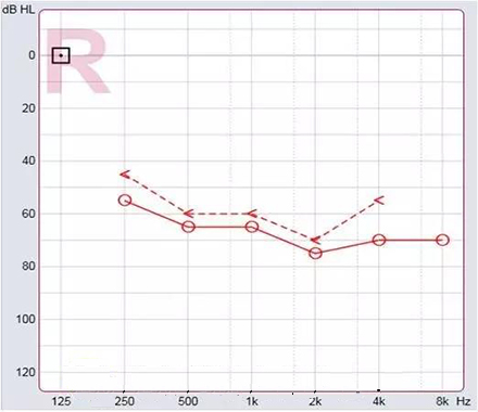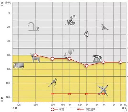 純音測試聽力圖的橫坐標為頻率,從左至右表示測試聲的頻率從低到高,即125Hz至8000Hz;縱坐標為強度,從上至下表示受試者能聽到的最小的聲音強度,以dBHL為單位。如下圖所示:</p><p> </p><center><img alt="" src="/upfiles/201903250213137760.png" width="440" height="400" /></center><p></p><p> 聽力圖的畫法自從1943年在C.C.Bunch的著作中出現后,至今沒有改變。通常右耳的測試結果用紅色表示,左耳用藍色。下圖是ASHA(1990)建議使用的各種標記符號,這些符號已在世界各地廣泛使用。</p><p> </p><center><img alt="" src="/upfiles/201903250213216822.png" width="440" height="250" /></center><p></p><p> 純音測試的測試項目有氣導、骨導、舒適閾與不舒適閾。那么這簡簡單單的聽力圖在驗配過程中有哪些重要作用呢?</p><p> 1、確定聽力損失程度</p><p> 按照世界衛生組織(WHO)1997年的標準,根據0.5kHz、1kHz、2kHz、和4kHz氣導平均聽閾值,將聽力損失分為輕度、中度、重度和極重度。</p><p> </p><center><img alt="" src="/upfiles/201903250213312187.png" width="440" height="180" /></center><p></p><p> 世界衛生組織(WHO-1997)的聽力障礙分級標準</p><p> 舉例</p><p> 下圖為某一聽力損失者所測得的聽力圖</p><p> </p><center><img alt="" src="/upfiles/201903250213367902.png" width="440" height="380" /></center><p></p><p> 0.5kHz的聽閾為65dBHL,1kHz的聽閾為65dBHL,2kHz的聽閾為75dBHL,4kHz的聽閾為70dBHL。則平均聽閾為(65+65+75+70)/4=68.75。將68.75dBHL代入以上分級表格,得到該聽力損失者的損失程度為重度。 聽力損失程度的確定有利于確定助聽器的功率。</p><p> 2、判斷聽力損失性質</p><p> 根據氣導、骨導的關系,可將聽力損失分為傳導性聽力損失、感音神經性聽力損失及混合性聽力損失。</p><p> 骨導與氣導之差大于10dB,且骨導在正常范圍內為傳導性聽力損失,表明聽力下降是由外耳、中耳病變引起。</p><p> 氣骨導一致(≤10dB)且都在正常范圍之外為感音神經性聽力損失。表明聽力下降是由耳蝸、聽神經損傷引起。</p><p> 骨導與氣導之差大于10dB,但骨導在正常范圍之外為混合性聽力損失,表明以上兩種聽力損失均有,由上述多種部位病變引起聽力下降。確定聽力損失性質還需結合臨床表現,也有助于助聽器佩戴效果的預測。</p><p> 3、解釋聽力損失者的日常生活困難</p><p> 聽力損失者在日常生活中經常遇到的問題有1)時而聽得到,時而聽不到;2)聽得到,聽不清;3)小聲聽不到,大聲受不了。</p><p> 時而聽得到時而聽不到</p><p> 以下圖平坦型聽力曲線為例,當周圍言語聲高于其聽閾,即處于曲線下方區域時,該聽力損失者能聽到;當周圍言語聲低于其聽閾,即處于曲線上方區域時,聽力損失者則聽不到對方的說話聲。此為“時而聽得到,時而聽不到”。</p><p> </p><center><img alt="" src="/upfiles/201903250213445950.png" width="440" height="340" /></center><p></p><p> 聽得到 聽不清</p><p> 中文漢語元音輔音的頻率及響度有其分布圖,如下圖所示。以陡降型聽力曲線為例,該聽力損失者聽不到大部分的輔音。聽得清不清楚,主要取決于高頻輔音聽得到聽不到。例如該聽力損失者“g”、“ch”聽不到,但“u”能聽到,因此,他會將“姑姑”、“出租”都聽成“uu”。聽不清楚時,再結合口型,前后句的冗余度猜測。猜對則談話繼續,猜錯則打岔。兒童聽力曲線若是如此,長期接收不正確的語音,會出現口齒不清。</p><p> </p><center><img alt="" src="/upfiles/201903250213526855.png" width="440" height="340" /></center><p></p><p> 小聲聽不到 大聲受不了</p><p> 小聲聽不到,大聲受不了是重振現象。以下圖聽力曲線為例,“飛機”處于不舒適閾附近,聽力損失者對“飛機”的聲音聽著受不了。另外,該聽力損失者聽不到“手表”等聲音。</p><p> </p><center><img alt="" src="/upfiles/201903250214013300.png" width="440" height="385" /></center><p></p><p> 為了更好地使聽力損失者家屬明白聽力損失者的困難,目前有較多的工具可以模擬聽力損失狀態下的溝通與交流。</p><p> </p><center><img alt="" src="/upfiles/201903250214075950.png" width="440" height="370" /></center><p></p><p> 比如,在聲音樣本中選擇“餐廳”,并選擇“正常”,可聽到正常聽力者在“餐廳”環境中聽到的聲音;若選擇“患者”,則可使聽力正常者聽到聽力損失者聽到的聲音,令聽力正常者親身體驗他們所處的“模糊世界”。</p><p> 在“典型聽力圖”中,有“輕度”、“中度”、“重度”、“極重度”、“陡降型聽力”等選項,若選擇“重度”,則可體驗重度聽力損失者所聽到的聲音。</p><p> 4、調試</p><p> 聽力圖在助聽器驗配調試過程中也起著非常重要的作用。</p><p> 首次驗配</p><p> 助聽器處方公式結合聽力圖計算出聽力損失者的目標增益,為驗配師的進一步調節奠定了基礎。聽力圖結果越準確,首次驗配的滿意度越高。</p><p> 調試</p><p> 在助聽器調試過程中,不能忽視聽力圖的作用。舉一實例:下圖為某助聽器佩戴者的聽力圖,經過多次降低高頻增益,仍反應聲音刺耳。通過對聽力圖的觀察,該佩戴者2kHz處的聽閾較高,且2kHz處的增益亦較多。將2kHz處的增益降低后,助聽器佩戴者的滿意度提高。</p><p> 讀懂聽力圖是驗配助聽器過程中非常重要的一環,只有讀懂聽力圖并解釋清楚聽力圖,對成功驗配助聽器可達到事半功倍的效果。在助聽器驗配調試環節,亦不能忽視聽力圖。聽力圖在整個助聽器驗配過程中起到不可替代的作用。</p><p> 更多詳情請登錄聽覺有道助聽器m.milwaukeetvs.com</p>" />