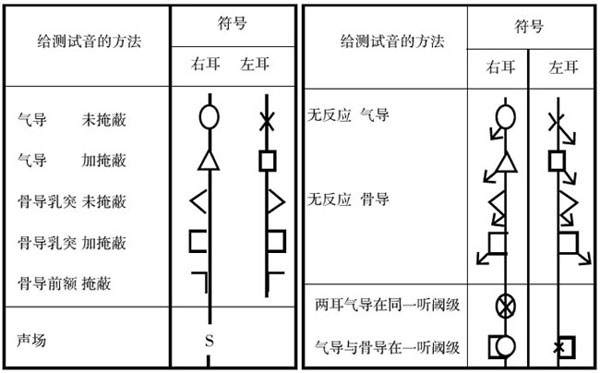 用聽力圖表示聽閾級時,應(yīng)采用上表所給符號,對氣導(dǎo)相鄰點用直線連接,骨導(dǎo)用虛線連接。如在聽力計最大輸出級仍無反應(yīng),可在相應(yīng)符號處垂直向下畫一箭頭,或在符號的下外角與垂直方向約成45o角向下畫一箭頭(即左耳符號箭頭向右,右耳符號箭頭向左)。無反應(yīng)的符號應(yīng)記在聽力圖上代表聽力計最大輸出的聽力級處。如用彩色筆記錄,右耳符號和連線為紅色,左耳符號與連線為藍色。從篩選測聽法得出的結(jié)果應(yīng)清楚地照此表示出來。
