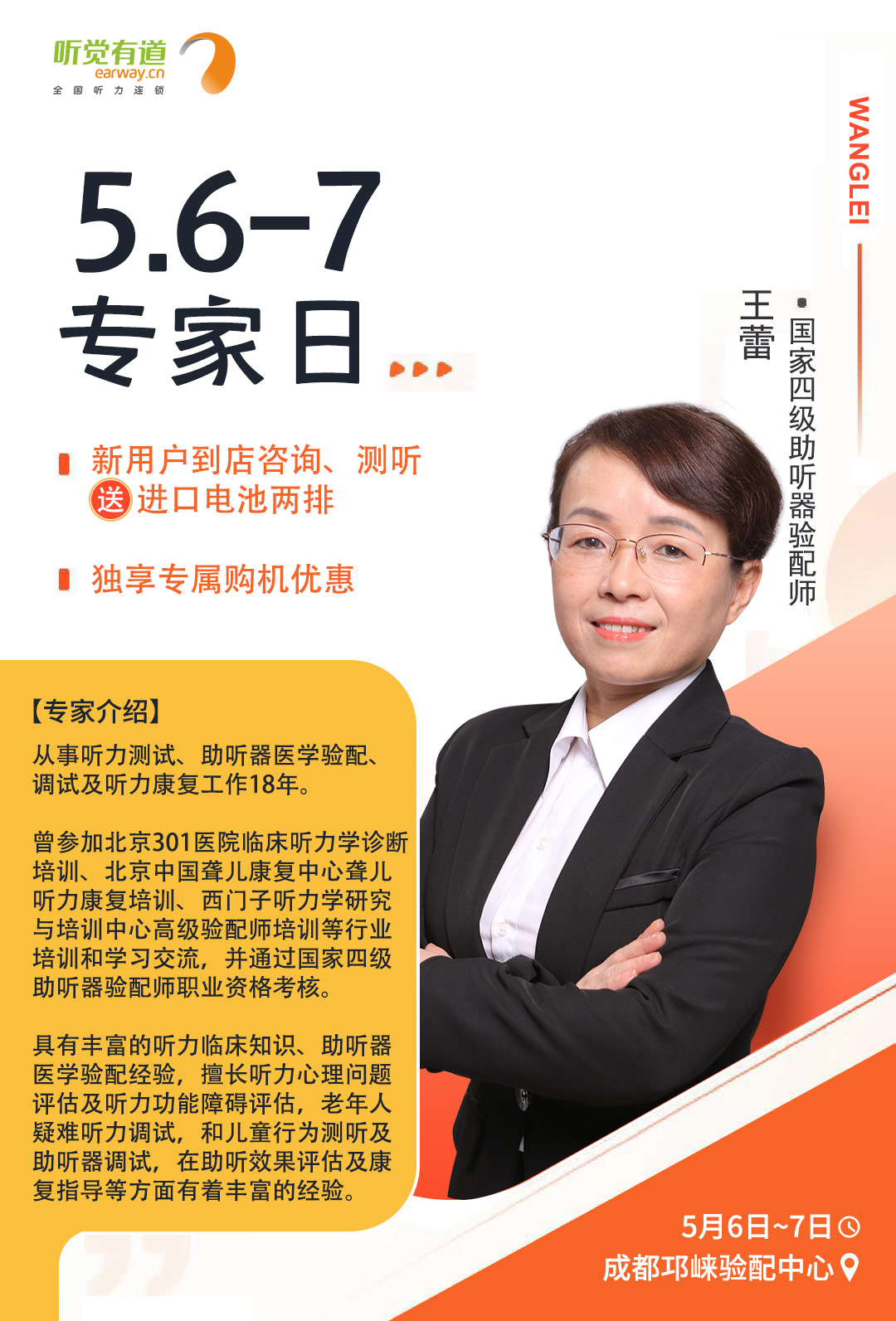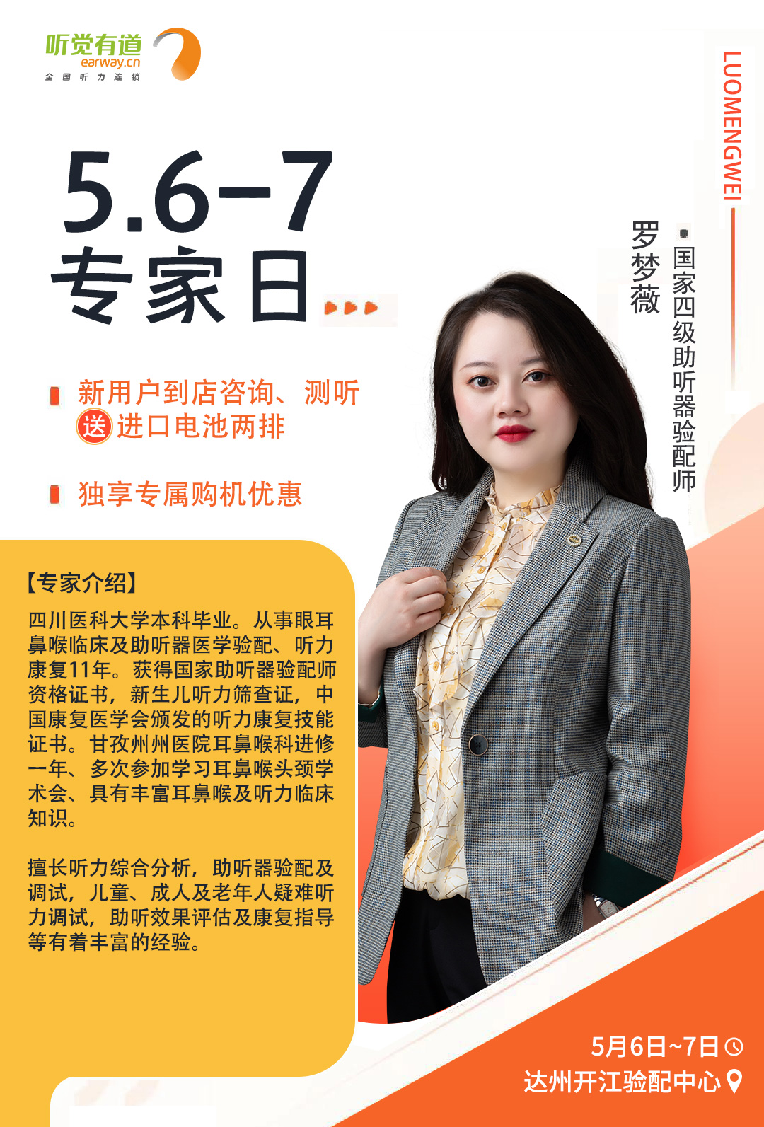 <span style="white-space:pre"> </span>為了更好地服務聽損人士,帶來高質量的聆聽感受,聽覺有道全國聽力連鎖將持續開展專家入店活動。<br /></span><p><span style="font-size:16px;">  專家日現場,聽覺有道金牌聽力專家將為您解答聽力相關問題,調試和驗配助聽器,讓您能夠更好地聆聽這個世界的美好。</span></p><p style="text-align: center;"><img src="/upfiles/202104300114022603.jpg" width="640" alt="" /><br /></p><p style="text-align: center;"><br /></p><span style="font-size:16px;">  <strong>活動預告<br /><br />  聽覺有道專家入店行程表</strong><br /><br />  聽覺有道東莞塘廈驗配中心<br />  時間:5月2日<br />  專家:李冬根<br />  電話:0769-87927386<br />  手機:18923091281<br />  地址:廣東省東莞市塘廈鎮塘廈大道中70-108號(水電三局對面)<br /><br />  聽覺有道達州開江驗配中心<br />  時間:5月6日~7日<br />  專家:羅夢薇<br />  電話:0818-8222079<br />  手機:19182813889<br />  地址:四川省達州市開江縣新寧鎮龍池街77號(開江縣人民醫院正門對面)<br /><br />  聽覺有道成都邛崍驗配中心<br />  時間:5月6日~7日<br />  專家:王蕾<br />  電話:028-88734181<br />  手機:18908177682<br />  地址:四川省邛崍市鳳凰大道484號高宇南庭(醫療中心醫院對面)<br /><br /></span><span style="white-space:pre"><span style="font-size:16px;"> 聽覺有道閬中張飛南路旗艦中心<br />  時間:5月18日~19日<br />  專家:王杰<br />  電話:0817-6250177<br />  手機:17398130629<br /></span></span><p><span style="white-space:pre"><span style="font-size:16px;">  地址:四川省閬中市張飛南路126號(人民醫院正對面)</span></span></p><p style="text-align: center;"><img src="/upfiles/202104300134599048.jpg" width="640" alt="" />&nbsp;<img src="/upfiles/202104300134592952.jpg" width="640" alt="" />&nbsp;<img src="/upfiles/202104300134592080.jpg" width="640" alt="" /><br /></p><p style="text-align: center;"><img src="/upfiles/202104300135382254.jpg" width="640" alt="" /><br /></p><p style="text-align: center;"><br /></p>" />