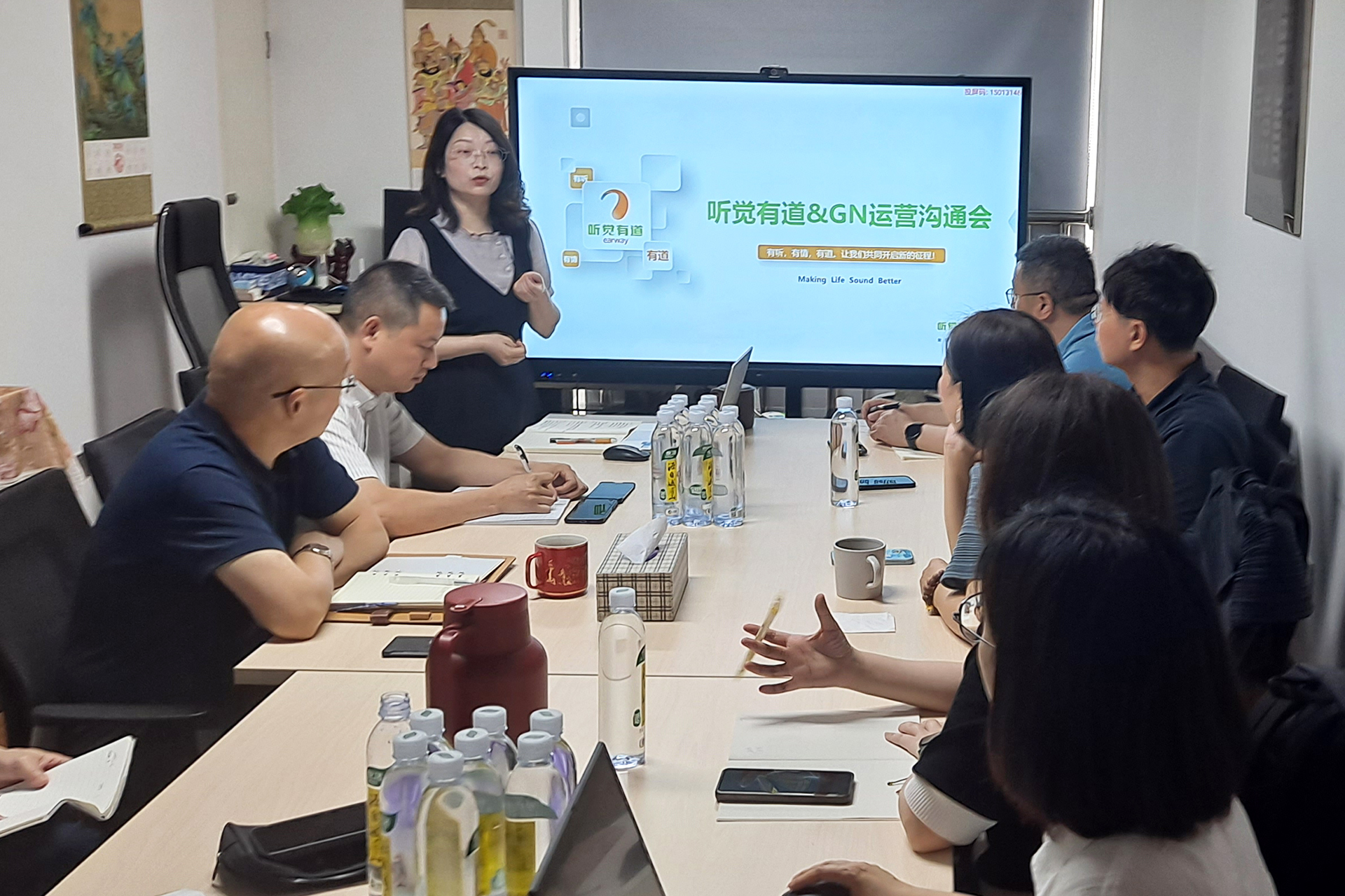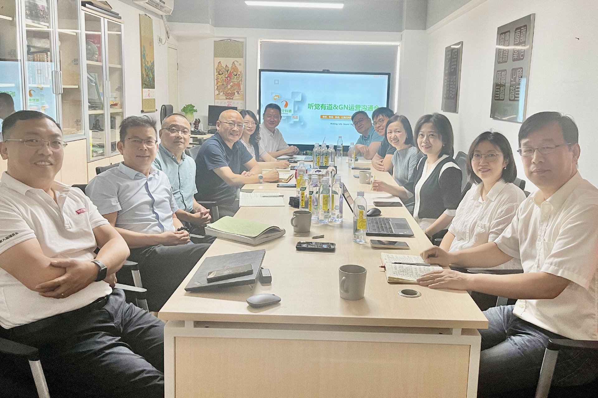 GN大北歐聽力中國區董事總經理孫曉沂率領銷售及培訓總監陳敬、客戶服務部總監張容艷、客戶服務高級主管周永樂、運營及項目部高級經理黃佳楠、售后服務經理陳海華、華西大區經理孫彥東、業務拓展部南區專員郭鳴一行八人到訪聽覺有道全國運營中心。